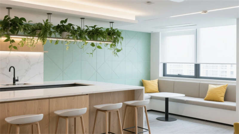 設(shè)計(jì)強(qiáng)調(diào)人文關(guān)懷,休閑區(qū)暖調(diào)燈光與柔軟卡座形成情緒緩沖帶,茶水間吧臺成為非正式社交樞紐。材質(zhì)選擇凸顯可持續(xù)理念,微水泥、再生木材與綠植系統(tǒng)貫穿始終,呼應(yīng)簡約背后的生態(tài)意識。整體空間在合肥這座創(chuàng)新之城,詮釋了高效辦公與人文溫度共生的當(dāng)代范式。
