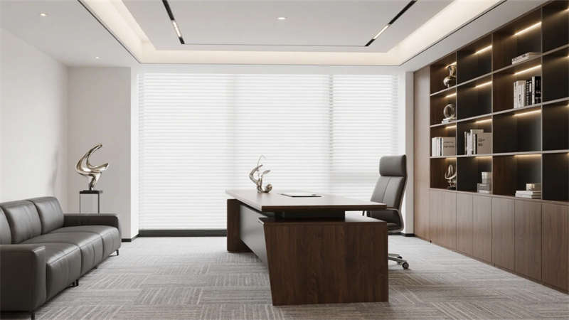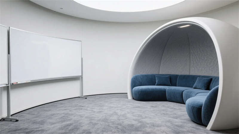 核心區(qū)域聚焦功能與美學(xué)的平衡:前臺木格柵墻以線性燈光延展空間縱深感;開放式工位區(qū)通過綠植與幾何畫作注入生機(jī);獨(dú)立辦公室運(yùn)用胡桃木與皮質(zhì)元素提升質(zhì)感,整墻書架成為智慧沉淀的象征。過渡空間被賦予多重價(jià)值——走廊生態(tài)墻引入自然呼吸,蛋形討論艙激發(fā)即興靈感,階梯圖書館則營造沉思角落。