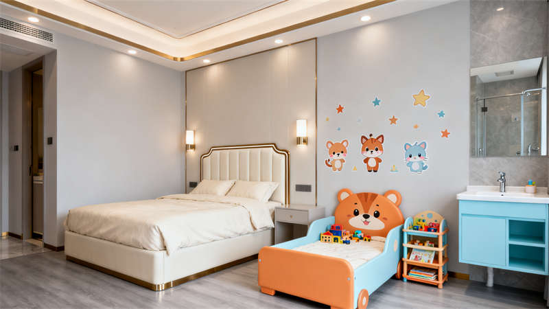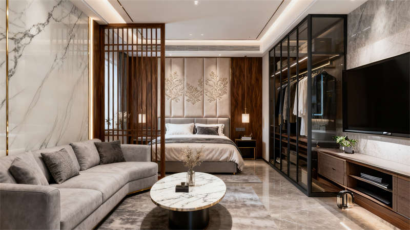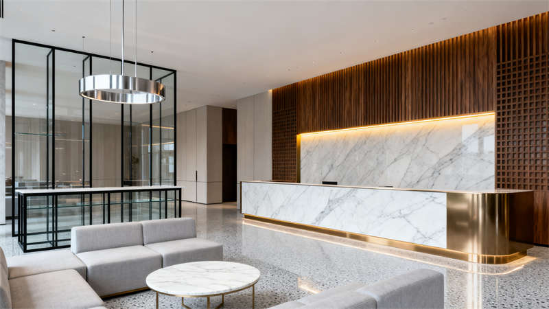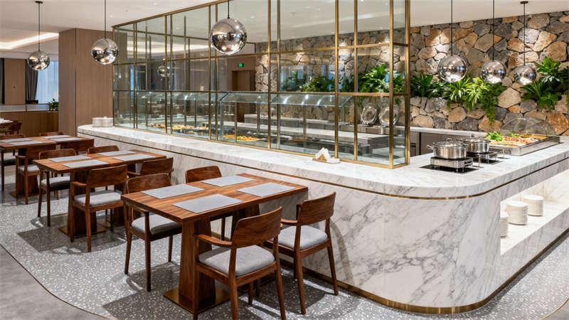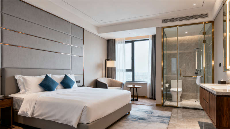公共區域與客房保持風格一致,從外觀的玻璃幕墻與石材拼接,到室內大堂的胡桃木格柵背景墻、餐廳的金屬框架與大理石臺面,每一處細節都延續了現代輕奢的設計語言。軟裝選擇上,莫蘭迪色系的抱枕、暖橘色的點綴,以及自然綠植的融入,為空間增添了溫馨感,讓整體裝修既顯精致格調,又避免了冰冷生硬,全方位提升了酒店的居住與體驗質感。?