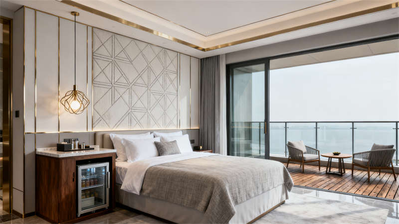 本設計以現代輕奢為核心風格,為蚌埠這家酒店打造出兼具質感與溫度的居住體驗。整體空間以低飽和的米灰色系為基底,搭配胡桃木的溫潤與金屬線條的精致,構建出統一且富有層次的視覺效果。?
