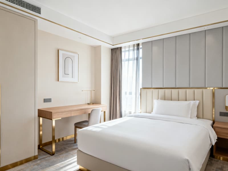 在空間布局上,充分利用4500平的開闊尺度,合理劃分大堂、客房、餐廳、宴會廳、健身中心等功能區域。各區域銜接順暢,既保證商務出行的高效便捷,又滿足休閑旅居的舒適體驗——例如標準客房注重實用性與靜謐感,行政套房強化尊貴感與功能性,宴會廳兼顧多元場景適配,健身中心與茶吧則豐富旅居生活維度。