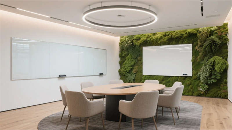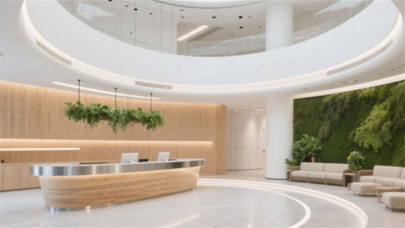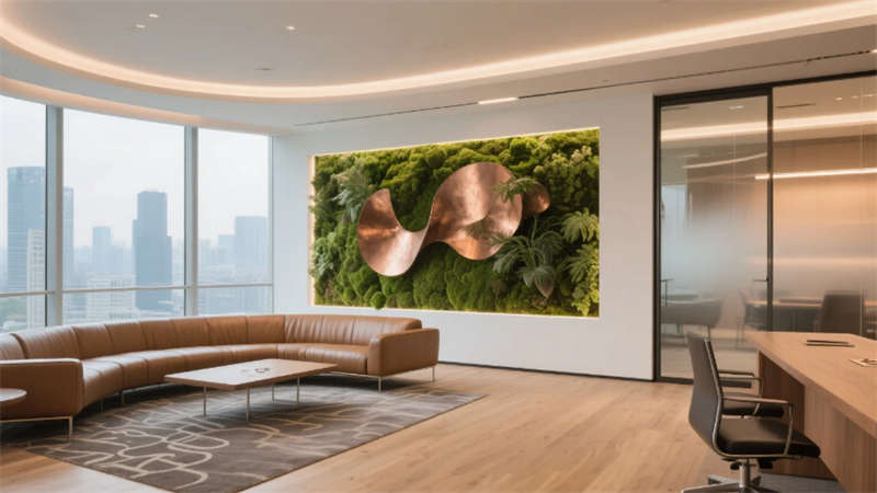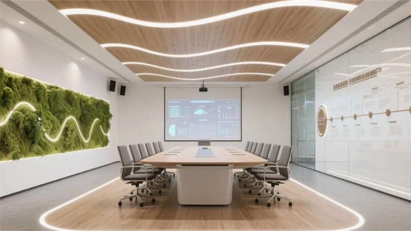 生態科技體系覆蓋全場景:經理辦公室苔蘚墻集成空氣監測系統,總裁室霧化玻璃聯動光伏發電,小會議室綠植墻搭載微滴灌節水裝置。材質選用安徽本土元素升級再造,大廳水磨石摻入大別山礦石粉,定制地毯紋樣提取徽派窗欞數字化變體。