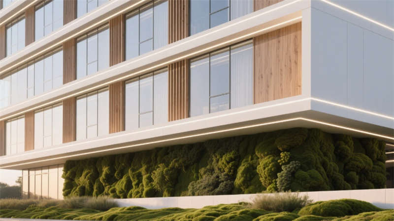 本案立足合肥科技創新城定位,以“自然滲透科技”為核心策略,打造7000㎡智慧辦公綜合體。外立面通過雙層呼吸式幕墻與垂直木紋格柵交織,形成動態光影濾網,底部苔蘚景觀帶同步凈化PM2.5,實現建筑與巢湖生態區氣候的有機對話。