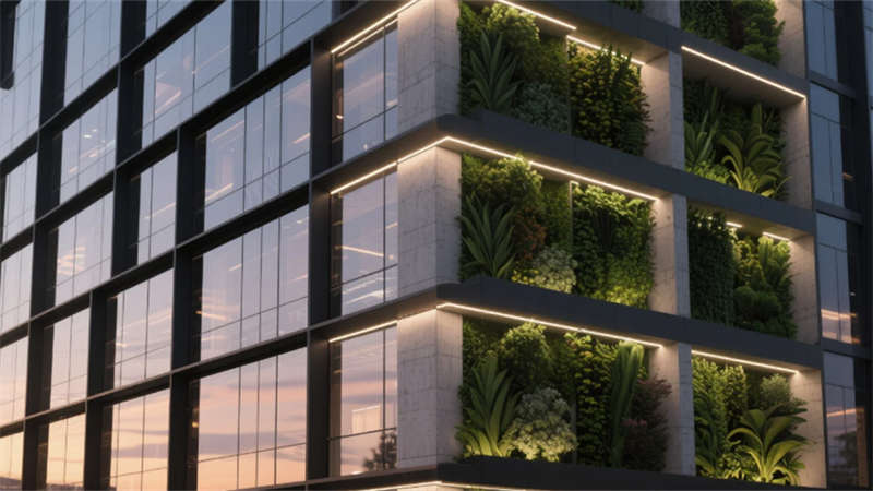 在工業肌理與自然呼吸的交織中,這座辦公樓以“輕工業生態美學”重塑城市辦公場景。外立面玻璃幕墻切割出幾何韻律,黑色金屬骨架與垂直綠植墻共舞,暮色中線性燈光如星軌流淌,將建筑化為城市中的生態燈塔。
