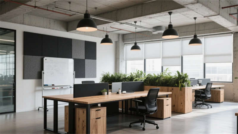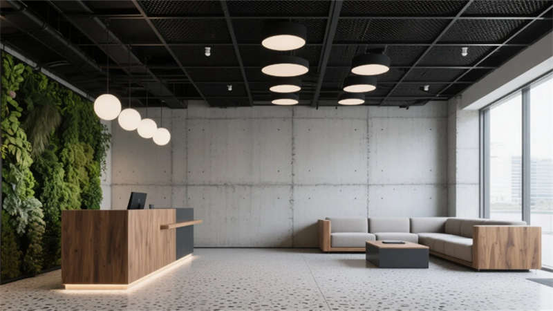 步入大堂,粗獷的混凝土墻面與水磨石地面形成質感對話,懸浮金屬網天花下,原木前臺與背光綠植墻暈染出溫潤生命力。開放式辦公區延續工業基調,模塊化橡木桌搭配黑色鋼架,綠植隔斷巧妙劃分空間,自然光穿過智能遮陽簾,在混凝土天花上投下流動的光影詩行。