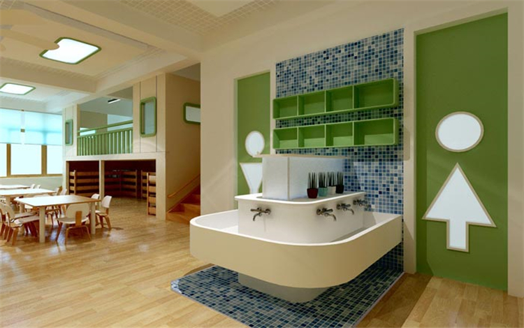 洗手區域的設計:此處通往的是就餐區,在洗手池的設計上,設計師對地面、洗手池都做了處理,目的就是為了避免因為水造成的地面濕滑,兩個門一個進一個出,設計是希望可以從小培養孩子排隊的意識,一進一出之間也見證了教育的重要性。