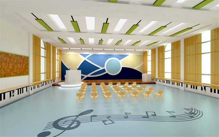 表演區域的設計:這是最后一個音樂教室,但是這個教室在屬性上與前兩個稍有不同,在滿足音樂教室的同時,也滿足表演的需求,設計師希望每一個孩子都是一個表演家,在臺上可以盡情的表演,培養每一個孩子表演、演講的能力。