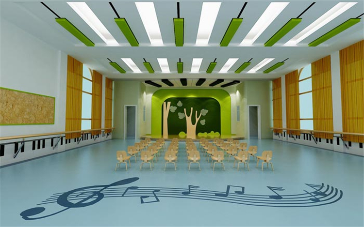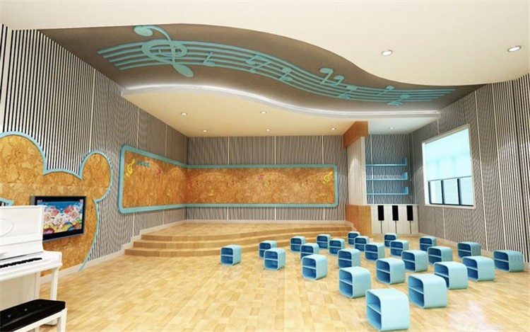 音樂教室的設計:這里大致可以容納下30多個小朋友,也就是大概一個班多一點點,能歌善舞是每個家長對于孩子的特殊期望,對于孩子本身來說也是一個不可不得的技能,在設計師看來若是引導得當,讓孩子喜歡唱歌、跳舞也不失為一件功德無量的事情。