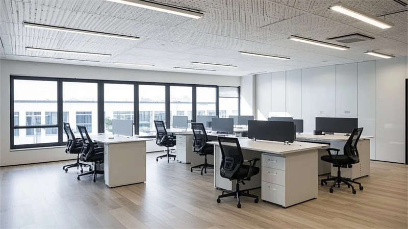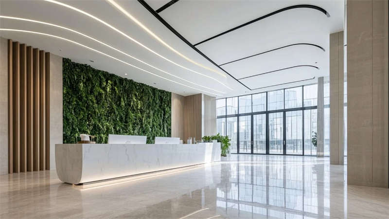 功能布局強調流暢性:開放式辦公區借全景落地窗引入室外綠意,提升工作舒適度;智能車間通過規整的管線排布與環氧地坪,傳遞高效與秩序;員工休閑區與生態中庭形成呼吸節點,綠植與藝術裝置柔化工業環境的剛性。設計注重光線的戲劇性表達,線性燈光與天窗協作,在走廊、會議室等區域投落細膩光斑,強化空間縱深感。