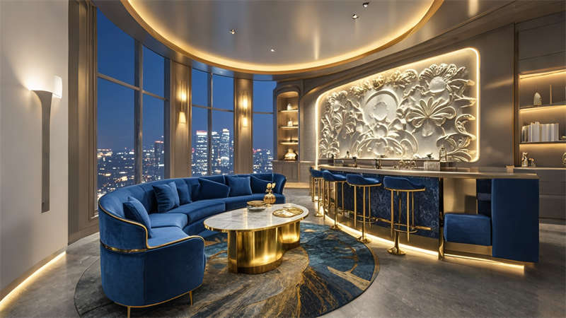 本案為6000平現代輕奢風格商務酒店,以 ' 城市綠洲 ' 為設計理念,將自然元素與科技美學融合。空間規劃采用動靜分區原則,1-3 層為公共接待區,4-8 層設置標準客房,9-10 層規劃行政專屬空間。色彩體系以香檳金、深海藍、暖灰為主調,搭配天然木紋與石材肌理,營造低調奢華的氛圍。智能系統貫穿全樓,包含環境光感調節、聲學優化及空氣質量管理。特色設計包括大堂三維立體藝術墻、客房可變光環境系統、頂層無邊際星空泳池,以及模塊化多功能會議系統,充分滿足商務客群對品質與效率的雙重需求。