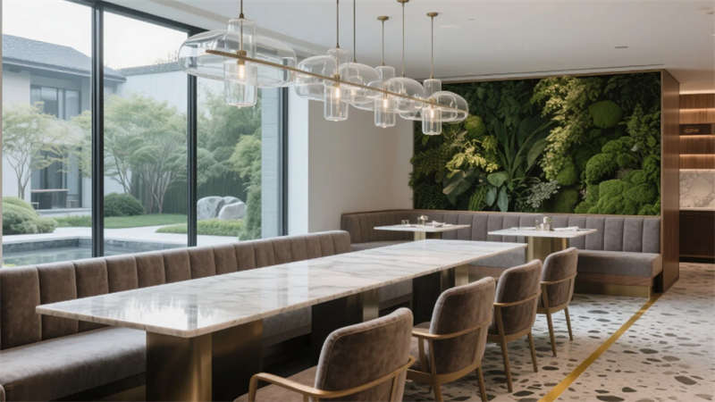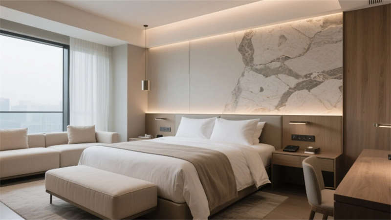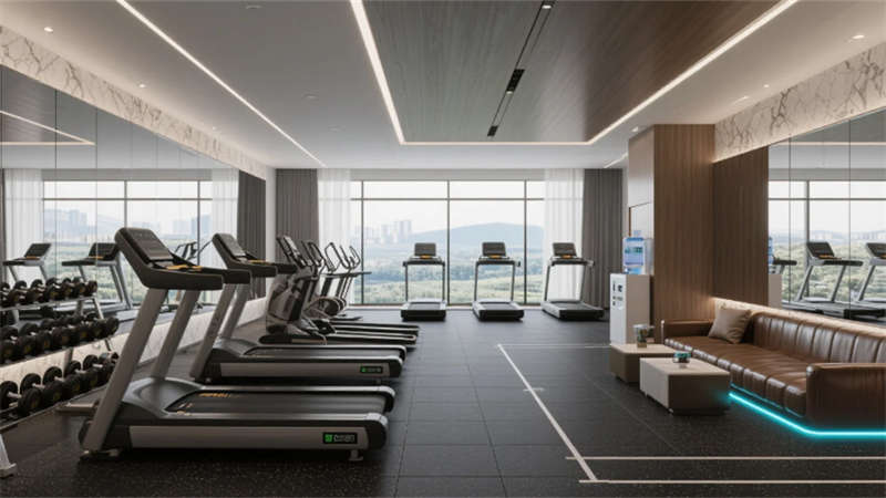 客房以中性色調(diào)為基底,亞麻、柚木與肌理墻面營(yíng)造松弛感,智能化系統(tǒng)隱于無(wú)形,從電動(dòng)紗簾到無(wú)線充電桌,細(xì)節(jié)中滲透科技溫度。雙床房的可移動(dòng)屏風(fēng)與定制家具,兼顧私密與靈活;衛(wèi)浴空間以霧面玻璃與水磨石打造朦朧質(zhì)感,啞光五金件點(diǎn)綴現(xiàn)代精致。餐廳以共享長(zhǎng)桌與綠植墻激活社交氛圍,水磨石地面鑲嵌的黃銅線條如溪流蜿蜒,呼應(yīng)徽派建筑中的流水意象。健身房鏡面與橡膠地面反射城市燈火,休憩區(qū)的皮質(zhì)軟榻與漸變燈光,為運(yùn)動(dòng)后提供片刻寧?kù)o。