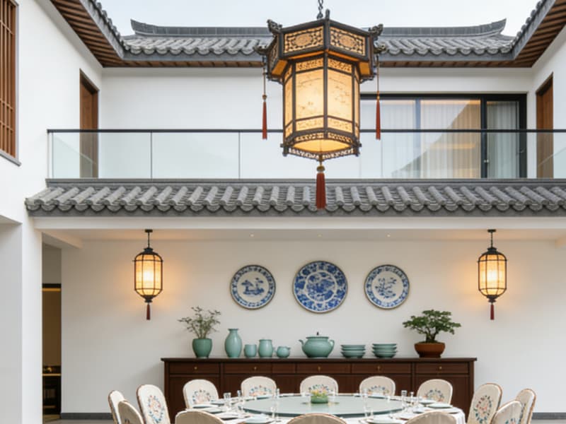 空間布局上,科學(xué)劃分公共區(qū)域與私密客房兩大板塊,公共區(qū)包含庭院、茶室、餐廳、書吧等功能區(qū),庭院植入徽派馬頭墻元素與青石板小徑,搭配枯山水景觀與原生綠植,營造靜謐雅致的入戶氛圍;茶室采用實(shí)木茶桌與半通透屏風(fēng),墻面懸掛徽州版畫,為客人提供品茗交流的休閑空間;餐廳以暖木色為主調(diào),配備開放式明檔廚房,兼具特色餐飲與小型聚會功能;書吧陳列安徽地域人文書籍,搭配柔軟布藝沙發(fā),打造放松閱讀的靜謐角落。
