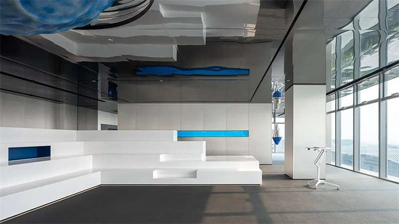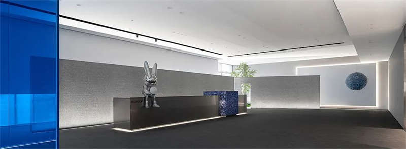 室內空間由功能家具和裝置形成自然分隔,空間整體因祛除隔斷而產生了流動,這與科學巨匠斯蒂芬·霍金的宇宙觀具有一種相通性。太空兔和隕石一起來到這里,被安置在接待臺和會議室中,向來訪的人們講述宇宙的故事,猶如那些激動人心的創業事跡一樣,源于有限的奇點,產生突破界限的無窮能量。