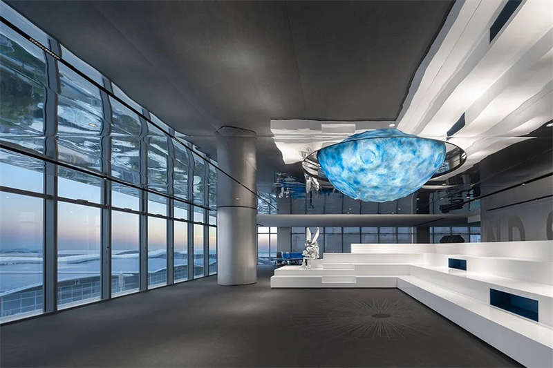 白色臺階半圍合而成的區域,擁有絕佳的風景,設計充分挖掘功能的實用性,帶有視覺沖擊力的隕石吊燈和Robbie兔,讓這里具備了舞臺的屬性,成為具有強交互感的沙龍區。