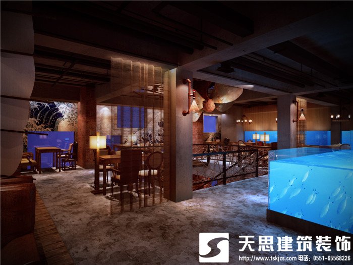 銅須水族主題會所,空間造型大氣磅礴,初入室內即被粗獷自然的設計所震撼。給人一種無限擴張的空間力量??臻g材料和色彩的運用細膩而大膽,情節化的場景布置與戲劇性的張力設計營造出豐富的視覺享受。