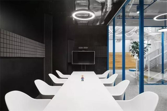 時尚與藝術并存的辦公室設計案例:整個空間設計手法簡約,原有建筑構造和設備管線都展露無遺,色彩的巧妙構筑讓這處極簡loft風的辦公環境充滿了時尚的活力氛圍。墻面上充滿活力的圖案和一張乒乓球桌是視覺中的主角,而主入口就在這里。這里沒有傳統的接待臺,訪客進入辦公室,可以為自己沖杯咖啡,然后進入到內部空間。入口處設有員工更衣室。辦公室的中央是一處大型演講廳,也是主要的活動場所。多功能演講廳配有看臺式階梯座、咖啡吧、屏幕和投影儀、講臺和所有其它必要的設備,即可以舉辦研討會、各種宣講,也是一處極為舒適的聚會場所。空間內的照明設計非常獨特,采用了網格狀的矩陣布局,將所有燈具串聯在一起,形成精致的美學效果。整個空間形成一個明亮的背景,襯托出有趣的設計細節和墻面圖形設計。