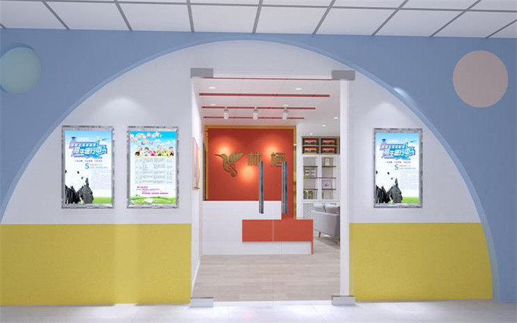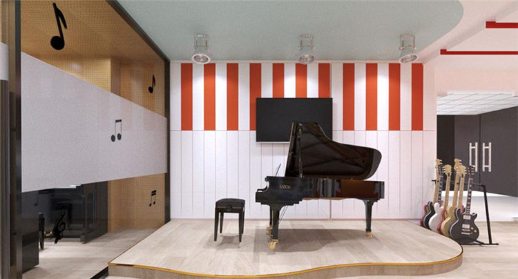 前廳不變的情況下,logo背景墻色調偏重,所以運用了色彩降噪,添加了一些偏冷色調,不僅能夠提升整個空間的舒適感,還能給孩子一個安全、放松的空間。結合了logo的主色調,再進行色彩搭配可以形成歡快、親切、活潑的色彩氛圍。與此同時還設置了也增加了兩間鋼琴室,提高了空間利用率。大廳玻璃教室內墻面貼了吸音板,一方面體現機構在音樂上的專業性,另一方面就是讓空間的隔音效果做到最佳,讓孩子在學習的時候不受干擾,能夠安靜的學習。